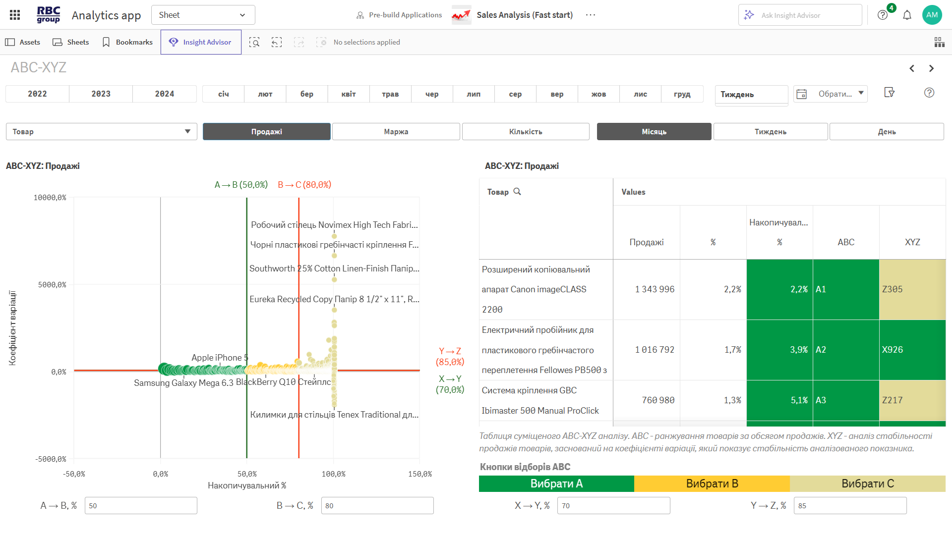 ABC-XYZ-анализ — это отличный инструмент, но его ценность раскрывается на полную только тогда, когда он встроен в работающую систему. В Qlik Sense методология реализована в виде готового дашборда от RBC Group. Это не просто красивые графики — это инструмент, который помогает управлять ассортиментом и запасами на основе данных, а не догадок.