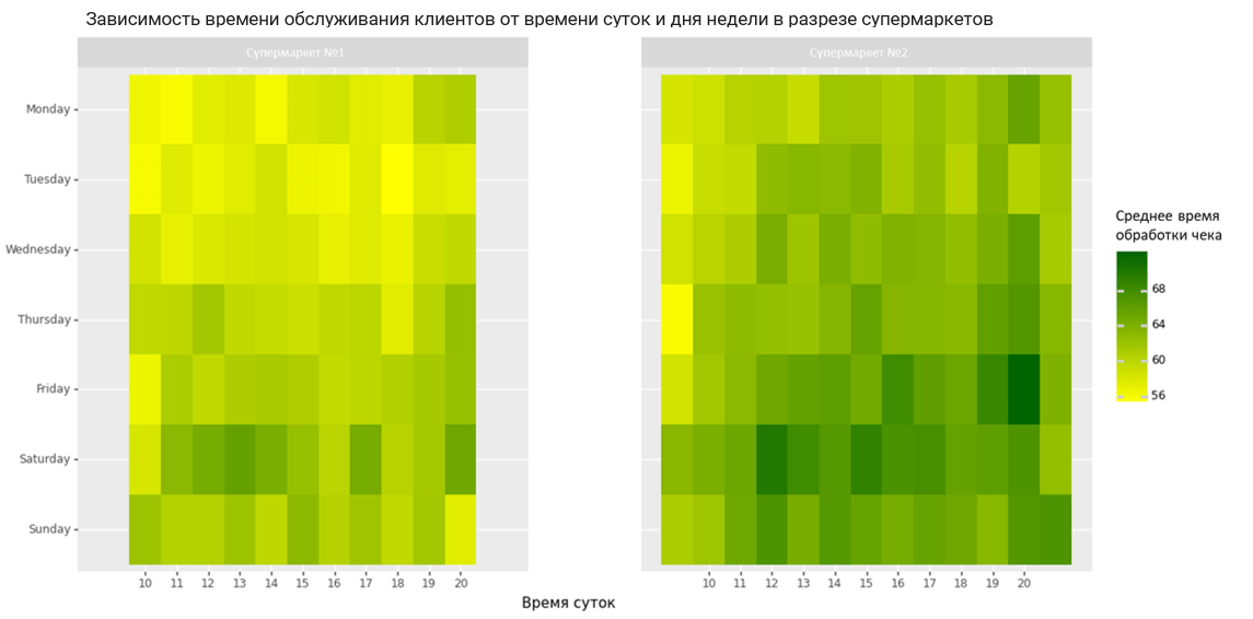 Легко заметить, что все данные у нас уже имеются. Интенсивность потока мы вычислим из прогноза трафика, целевой SLA укажут менеджеры, отвечающие за клиентский опыт, а среднее время обслуживания можно получить или постояв с секундомером или взяв время обработки каждого чека и добавив время на расчет покупателя, усреднить полученный показатель. Но, как часто бывает, простое решение не является самым точным. Если мы посмотрим на диаграмму ниже, то легко заметим как меняется среднее время обработки чека в зависимости от конкретного супермаркета, дня недели и времени суток. И эти изменения довольно существенны и достигают иногда 20%.
