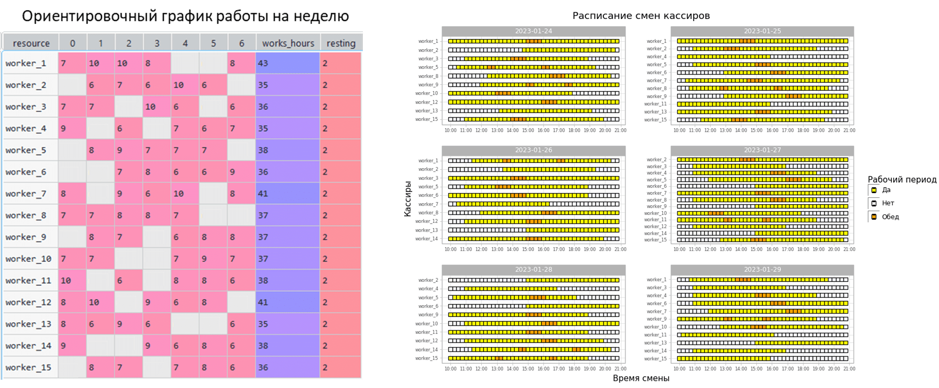 Теперь у нас есть точные данные о потребности в открытых кассах и нам необходимо превратить эту информацию в план выхода на работу реальных кассиров. Если затраты на персонал не имеют значения, то это очень легкая задача. Но в реальности на ее решение необходимо потратить много времени потому, что кроме пожеланий каждого кассира по началу работы и выходным необходимо также учесть множество других правил, например: