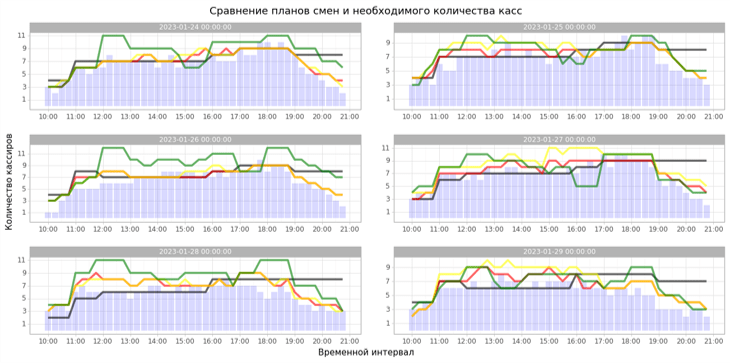 Такой подход дает возможность увеличить доступность касс, а значит и уменьшение очередей, примерно в 3 раза, при этом оплачиваемые трудозатраты кассиров будут сопоставимы с заложенными в планах, которые ранее составлялись вручную.