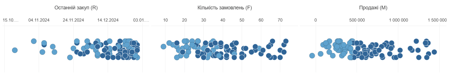 В Qlik результаты сразу визуализируются в виде блоковых и точечных диаграмм. Это позволяет увидеть распределение клиентов по сегментам, а также анализировать поведение по каждому фактору — давность последней покупки (R), частота заказов (F), общий вклад (M). Например, на точечной диаграмме клиентские группы отображаются цветами по сегментам RFM, что делает сегментацию наглядной и удобной для работы.