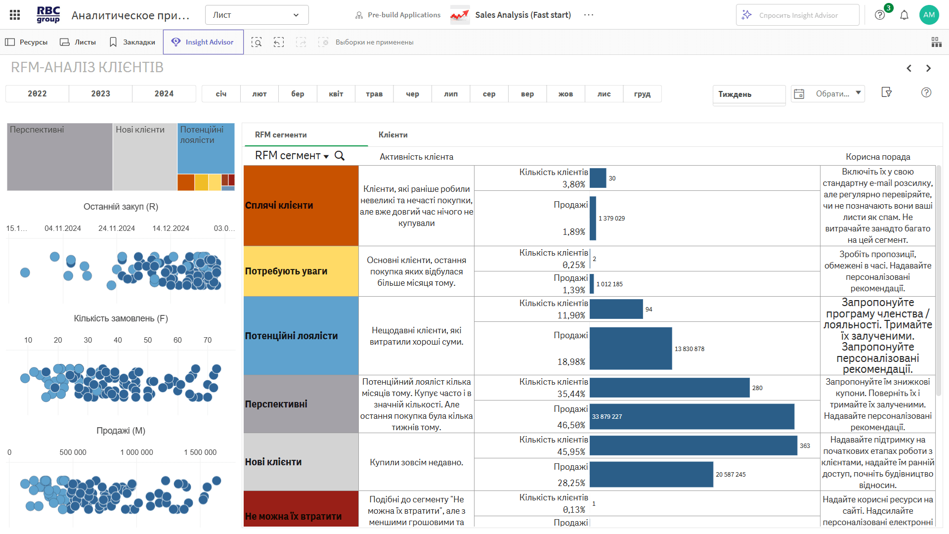RFM-анализ сам по себе полезен, но настоящую ценность он приносит, когда встроен в аналитическую систему. В Qlik Sense RFM-методология реализована в виде готового дашборда от RBC Group. Это инструмент, который позволяет за секунды сегментировать клиентов и получать практические рекомендации для маркетинга и продаж.