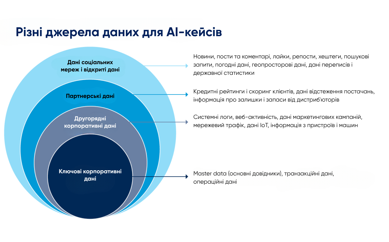 | Другорядні корпоративні дані (логи систем, вебактивність, IoT, маркетинг) | Структуровані, неструктуровані, напівструктуровані, тимчасові ряди, синтетичні | Доступ, узгодженість, інтероперабельність | Підтримувати єдині визначення об’єктів і синхронізацію даних |