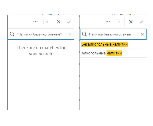 Ймовірно, при пошуку значень в Qlik Sense ви найчастіше використовуєте простий пошук, тобто вводите слово у відповідне поле. Як ви можете бачити, в цьому випадку Qlik Sense повертає всі значення, що містять кожне окреме слово. У верхній частині списку знаходяться результати, що містять найбільшу кількість слів з вашого пошуку, а в нижній частині списку є результати, що містять менше заданих вами слів.
