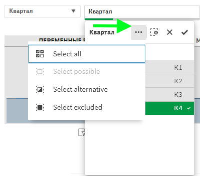 Коли певне значення вибрано, фон стає зеленим. Решта значень у даному фільтрі стають альтернативними. На цьому етапі в меню вибору з’являються додаткові опції для вибору.