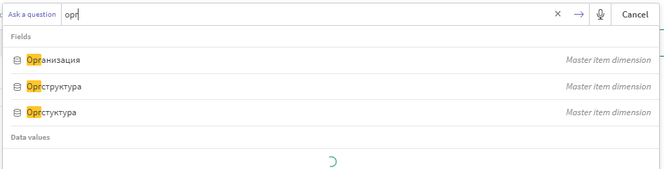 Якщо ви не знаєте назву поля, а знаєте лише, яке значення шукаєте, ви можете скористатися опцією “Розумний пошук” у верхньому лівому кутку аркуша. Все, що вам потрібно зробити, це ввести фрагмент значення, і Qlik вже почне пропонувати можливі набори вибірок на вибір. Просто натисніть на одну з пропозицій, щоб застосувати вибірку.