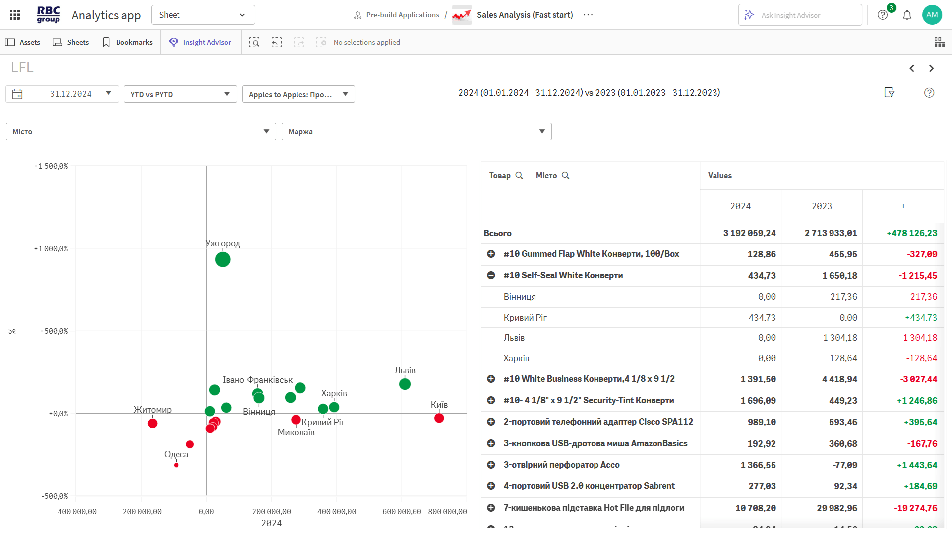 Порівняння показників “в лоб” рідко дає коректну картину. Зростання продажів може бути викликане розширенням асортименту, а не реальним збільшенням інтересу до товарів. LFL-аналіз у Qlik знімає цей шум і показує чисту динаміку за однаковими умовами: один і той самий асортимент, один і той самий період.