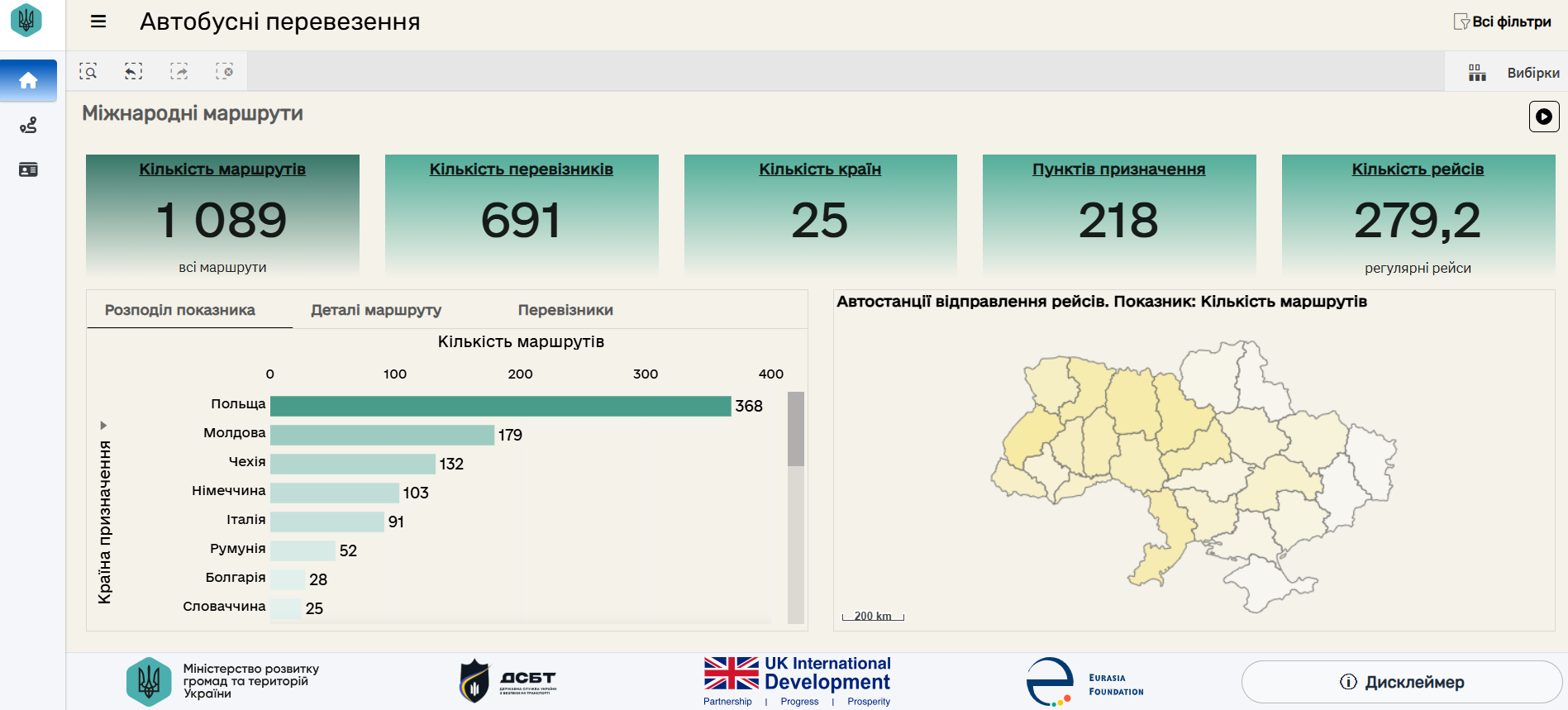 Головний дашборд “Міжнародні маршрути” демонструє загальну картину мережі перевезень: кількість маршрутів, кількість перевізників, кількість країн, пунктів призначення та регулярних рейсів. Ці дані дозволяють оперативно оцінити масштаби й географію транспортних зв’язків.