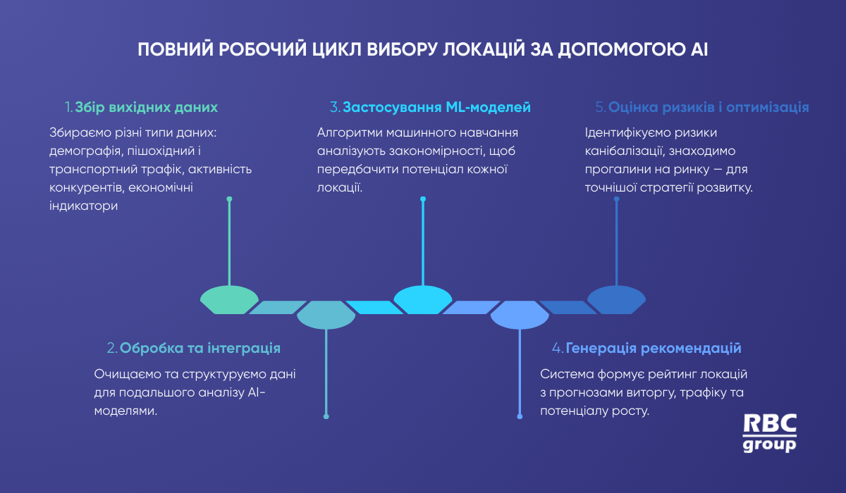 Щоб краще зрозуміти, як виглядає повний процес вибору локації з використанням штучного інтелекту, — ось покроковий цикл, який лежить в основі: