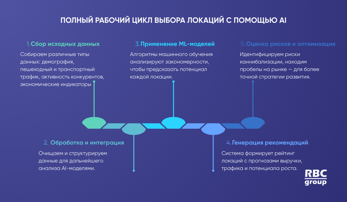 Чтобы лучше понять, как выглядит полный процесс выбора локации с использованием искусственного интеллекта, — вот пошаговый цикл, который лежит в основе: